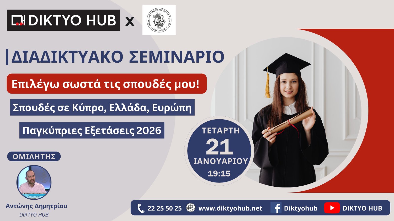 Δωρεάν Διαδικτυακό Σεμινάριο με θέμα: Επιλέγω σωστά τις σπουδές μου: Σπουδές σε Κύπρο, Ελλάδα, Ευρώπη - Παγκύπριες Εξετάσεις 2026